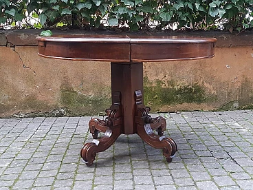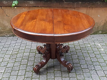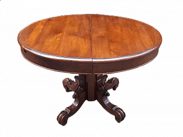 Oval table of Bolognese origin, in solid walnut wood, mid 19th century. Beautifully proportioned piece of furniture, the important foot supports it centrally, in the under top two concealed feet support it once extended. Intact and refined piece of furniture. Extension of cm +100