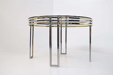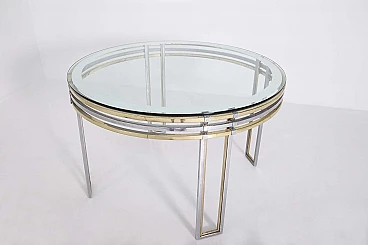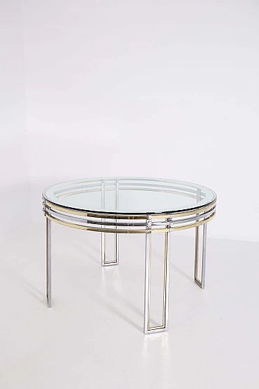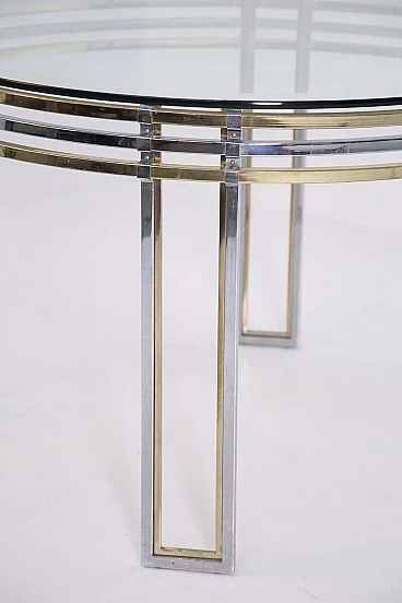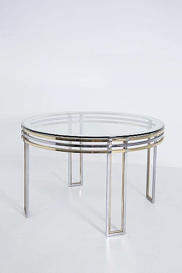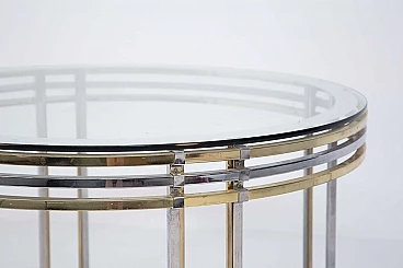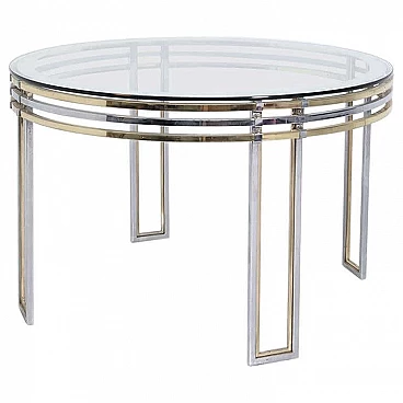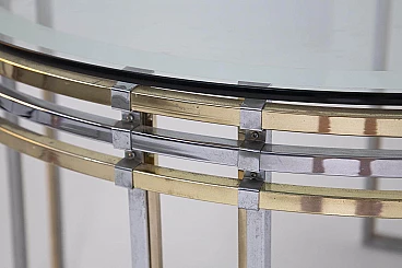 The table is made of brass and steel rods. Its elegant beauty given by its cleverly spaced brass and steel brackets make this product very sophisticated and accurate in its composition. Its top is made of thick glass from the period and is perfectly circular, giving lightness through its transparency. We notice a detail in the glass: near its circumference the glass has a mirrored edge inserted inside. Original condition. It has some light scratches due to its use and age. beautiful patina in the brass.