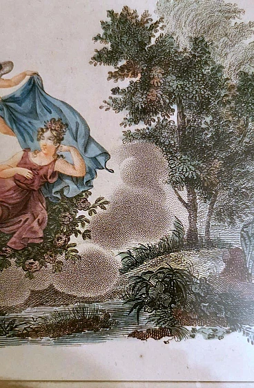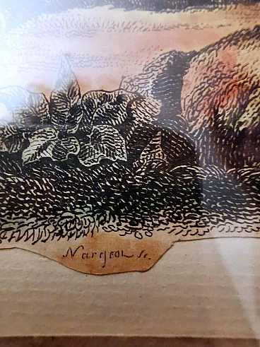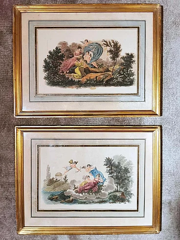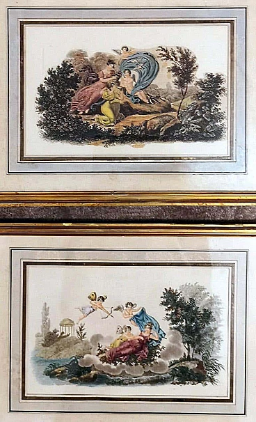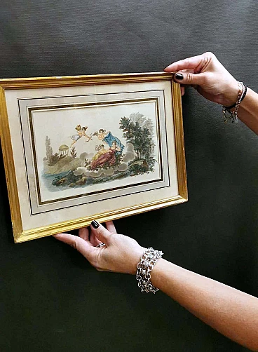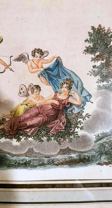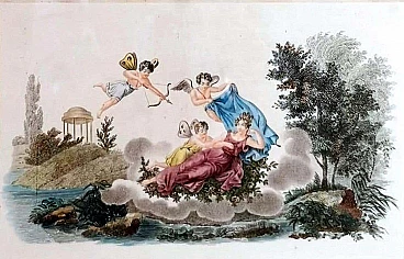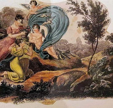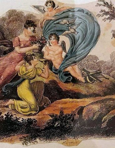 Pair of prints engraved by burin and painted in watercolour; both are a tribute to Cupid. The name Cupid - meaning desire, lust - was given by the Romans to the Greek god of love, actually called Eros. Alternatively, he was just called Love by the Latins. As the son of Aphrodite, goddess of love, he, like his mother, was capable of any act, even regrettable ones. In the first print, cut out and shaped, there are two young girls offering God a basket of fruit and a goblet of wine; in the second print a mature woman is about to be shot by Cupid's love arrow; both prints were made with a beautiful burin engraving, then finished with delicate watercolours. The frames are handmade in gilded wood. The prints were made between 1850 and 1855 by Adrien Nargeol (see signature), a prolific and talented French engraver, and were published in the "Journal des Demoiselles", a publication founded in Paris in February 1833 by Madame Jeanne-Justine Fouqueau de Pussy; aimed at girls aged 14 to 18 from wealthy backgrounds, the Journal des Demoiselles devoted a limited section to education and science, to the benefit of literature, fashion and theatre. The articles are in good condition. Prints measures width cm.22, height cm.14. For all our shipments we use special packaging materials (wooden crates, polystyrene, etc.) for maximum protection and safety of the items.