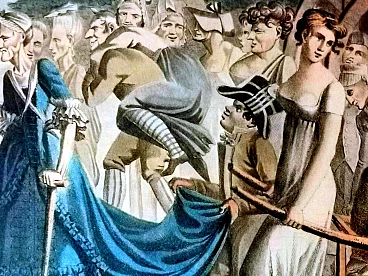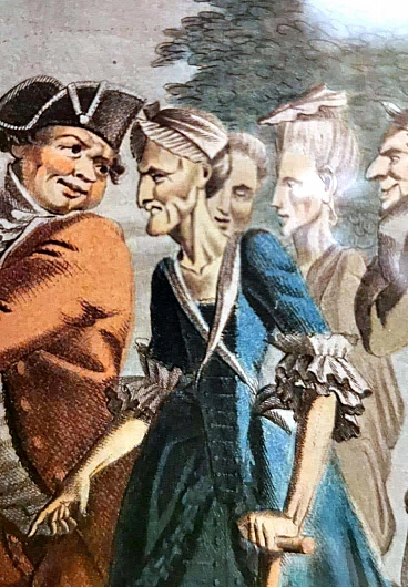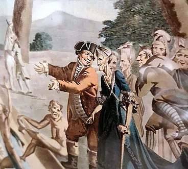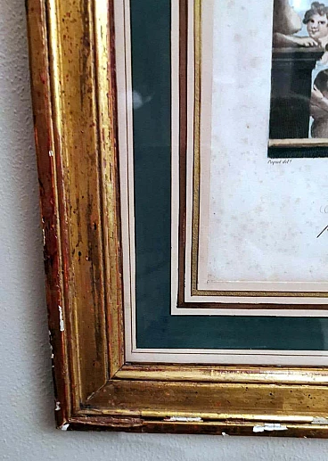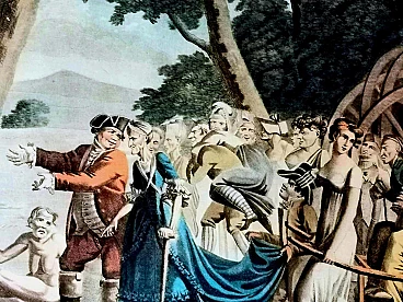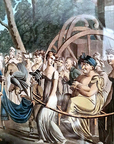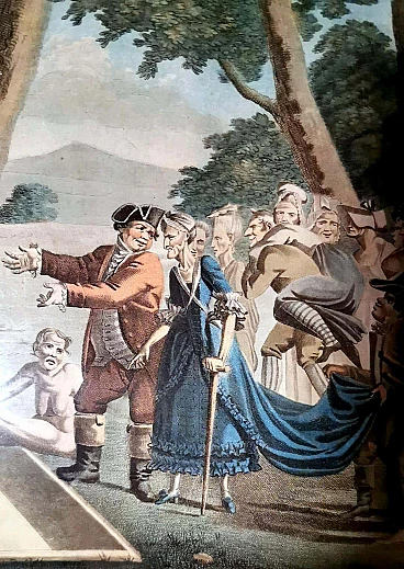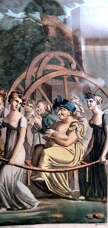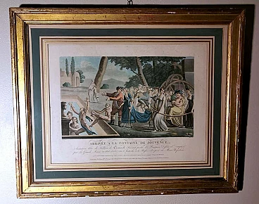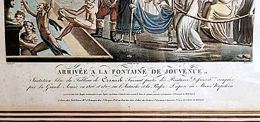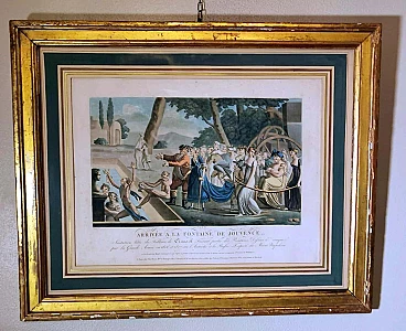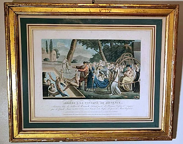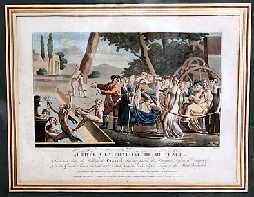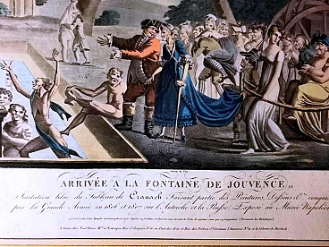 Particular and rare colour etching with a gilded wooden frame; the scene represents the arrival at the Fountain of Youth of a large group of people led by a friendly guide who invites them to plunge into the magical waters; the group is composed mainly of women, all old or fat, ugly or skeletal, who approach the fountain in the hope of changing their ugly features. In the foreground, the guide specifically addresses an old, sullen-looking noblewoman, while a dwarf dressed as a page holds the woman's cloak. The etching was executed between 1808 and 1810 by the famous engraver Jean Baptiste Morret, who was inspired in allegorical form by 'The Fountain of Youth', an oil painting on wood, measuring 122.5 × 186.5 cm, made in 1546 by the German painter Lucas Cranach the Elder, and kept in the Gemäldegalerie in Berlin. As stated in the caption, the etching is part of a collection of paintings and drawings in the Napoleonic Museum in Paris that praise the victories of Napoleon's French 'Grande Armèe', which defeated the armies of Austria and Prussia, united against France, at the Battle of Jena (14 October 1806), then the Battle of Eylau (7-8 February 1807) and finally the Battle of Friedland. The caption also states that 'Jouvance' is the name of a nymph who was transformed into a fountain by Jupiter and whose waters had the virtue of rejuvenating those who bathed in them. The caption also tells us that the etching was printed in Paris by Noel Freres Maestri di Stampa at "Rue Saint Jaques 16 a Pont des Arts and Rue des Pretes Saint Germain l'Auxreois n.22 a la Colonne de Rosback". Jean Baptiste Morret was a very skilled and talented engraver of the French school active in Paris between 1790 and 1820, he made many portraits of Napoleon and some of his works are exhibited in the British Museum. The print is in good condition, while the gilded wooden frame has some defects (see photo). The print measures 40cm wide, 30cm high. For all our shipments we use special packaging materials (wooden crates, polystyrene, etc.) for maximum protection and safety of the items.