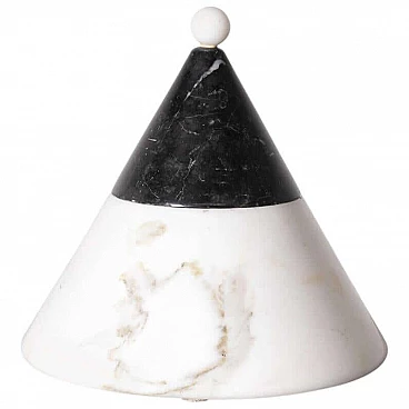 Modern centrepiece designed by Massimo Vignelli in the 1970s. The centrepiece is made of two pieces of marble, it is also a container: thanks to the extraction of its lid we find inside an object holder. The lid is made of black Marquina marble. As a knob there is a small sphere in white Carrara marble which allows its opening from the central body. Its clean and essential shape gives modernity and vigour to the whole furnishing.