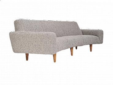 3-person banana sofa, design by Illum Wikkelsø, model 450. Completely refurbished - upholstered in quality furniture wool fabric. New upholstery. Beech legs. Original brass springs in the seat. Manufactured by Århus Polstermøbelfabrik circa 1970. Refurbished according to the original design by a professional upholsterer, craftsman. The sofa has no defects, but may show slight traces of use.