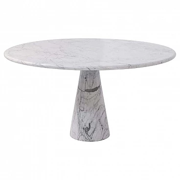 Two-piece round dining table in Carrara marble by Angelo Mangiarotti. Central table. Model M1 T70 1969 and manufactured by Skipper in Italy. Beautiful strong grain throughout and striking marble for the plateau. No chips, cracks or restorations. The top has a recess in the lower unit and rests on the pedestal. No chips or restorations. Excellent condition. No condition issues. Perfect condition. The table is ideal for elegant living rooms and sophisticated centre tables. Original label present under the top.