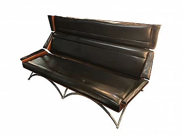 Two seater Mid-century sofa in the style of the American designer Miller, but made in Italy in the 1960s. Bended wood structure on metal feet and black faux leather seat. Excellent conditions.