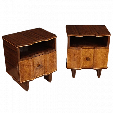 Pair of mid-20th century Italian bedside tables. Carved furniture veneered in walnut, rosewood, beech and briarwood. Bedside tables with one door, one open compartment and wooden top in character, of good size and service. Small tables for bedrooms or living rooms, of excellent proportion and pleasing decor, for antique dealers and interior designers. They show some minor signs of wear, overall in good condition.