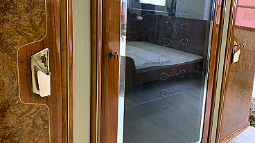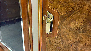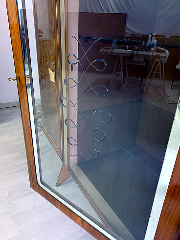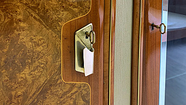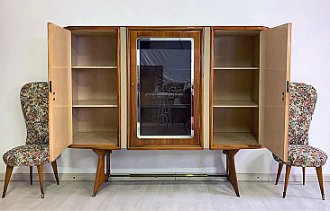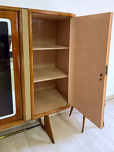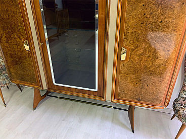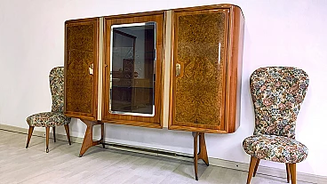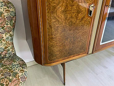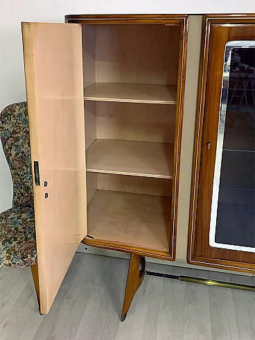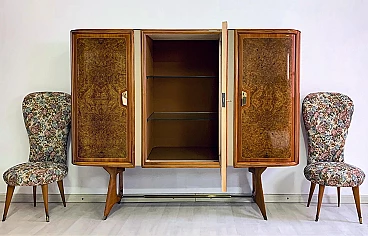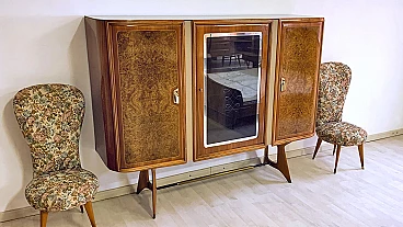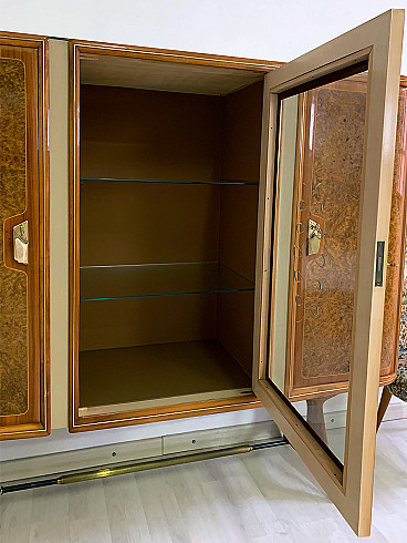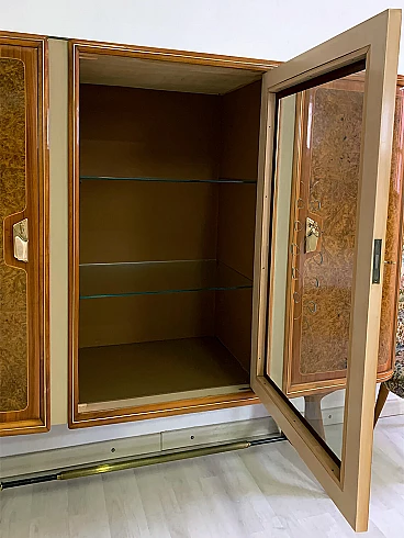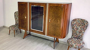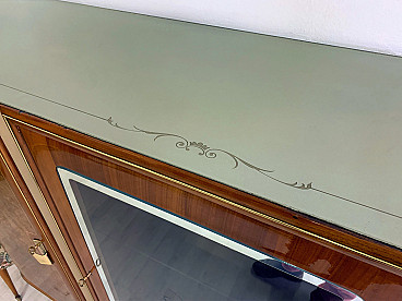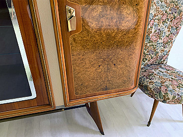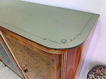 Superb sideboard and/or bar cabinet designed by Vittorio Dassi in the 1950s. It is a very fine object made of fine materials such as the two side doors in birch briar, finished with fine brass handles, while the central door is internally decorated with a carved glass. Its base is composed of solid wood legs finished with brass details, characterised by an original curved design, while the top of the cabinet is a retro-treated sage green coloured glass, with floral decorations around the perimeter. The sideboard is ready to use, its vintage condition is good/very good as shown in the pictures, with slight signs of wear consistent with age and gentle use.