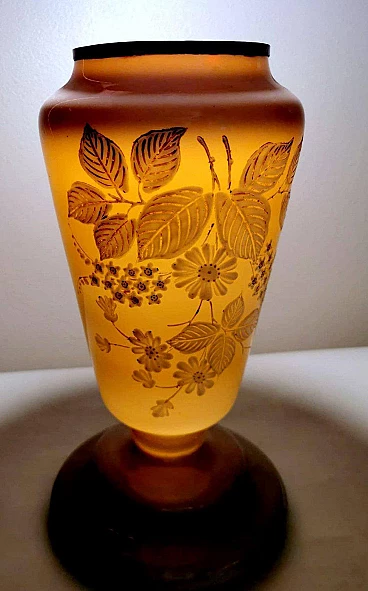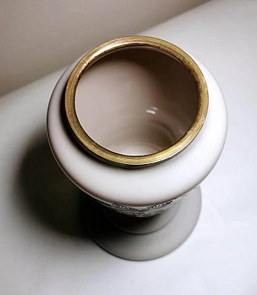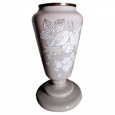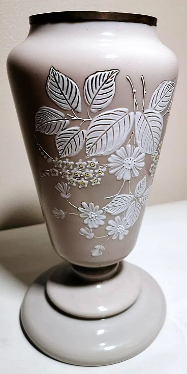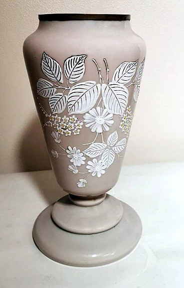 Delightful and refined vase made of grey opaline glass; the grey colour in opaline glass is very difficult to achieve, because, unlike white, the opacifying substances have to be balanced with the glass in an absolutely perfect way; the shape of the vase was obtained by blowing, then while the body was still warm the round base of compact opaline glass was applied, then the whole was left to cool for several hours; Then a skilful painter-artist, using white and a little yellow enamel, meticulously hand-painted pretty leaves and delicate flowers in relief, then finished the rim of the vase with gold paint, at which point the object was put back into the kiln to vitrify the enamel of the decorations, the craftsman having created a special and unique object. It was made in Art Nouveau style in France between 1930 and 1932 in a workshop in Wimmenau, in the Vosges region, an area made famous by the important glassworks in the area (Saint-Louis, Lalique, etc.). The vase also has a wonderful surprise in store for us: when lit, it takes on a completely different colour and transparency from the original! By changing the intensity and angle of the light yourself, you can enhance the charm and beauty of this unusual and extraordinary object. Opaline is a slightly translucent glass, opacified with phosphates and chlorides of sodium and calcium with the addition of tin oxides and talc, resulting in various shades of colours from pastel to milky white; opaline glass is much less dense and opaque than milky glass (very similar to porcelain); opaline glass in the strictest sense is a French product which originated at the end of the 18th century - beginning of the 19th century in imitation of Murano and German semi-opaque glass from the 17th century and which had its moment of maximum splendour from 1820 to 1870 thanks to the achievements of French factories (Baccarat, Saint Louis and Choisy-le-Roy); from the 19th century onwards, opaline glass spread throughout the world with the production of handmade objects for everyday use. France, from ancient to modern times, is recognised as a producer of the best quality opaline glass. The vase is in excellent condition.