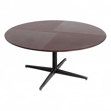 Low table designed by Osvaldo Borsani for the Tecno factory in the 1950s, made of precious wood with a circular shape. Its round top is characterised by skilful woodwork. Its pedestal structure in painted iron gives the piece of furniture solidity and at the same time simplicity and elegance. In fact, Tecno's creations have been the flagship of Made in Italy design. The three feet have a brass plate.