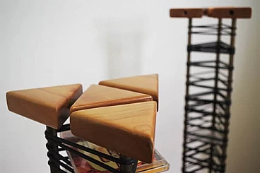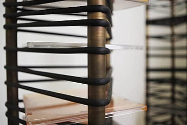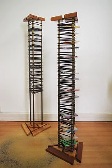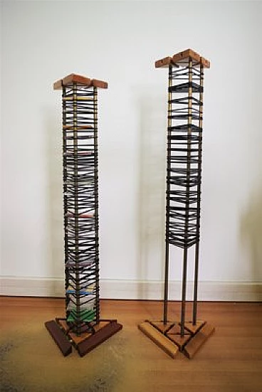 Pair of CD rack columns handmade by an italian artist from wood and brass, 1980s.