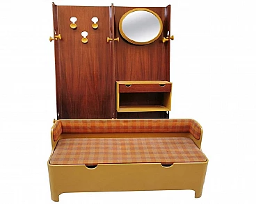 Rare entrance set designed by Carlo De Carli and produced by Fiarm Scorzè in Italy in the 1960s. The set is composed of 1 coat rack with mirror, 1 armchair, 1 drawer for objects and 1 umbrella stand Lacquered clothes hooks in excellent condition. Armchair with chest of drawers and opening seat in very good condition. Mirror in good condition. Storage drawer in excellent condition. Complete with all its components as shown in the photo Material: Bent and lacquered plywood, Modular and divisible at will The lot as described does not have defects as shown in the picture in excellent condition despite its age.
