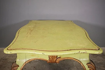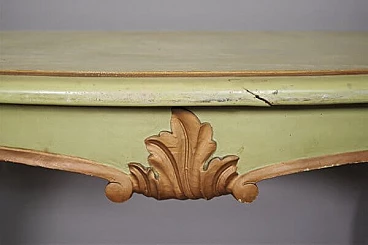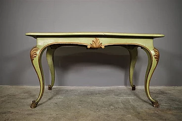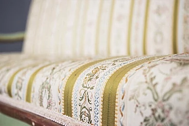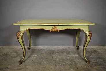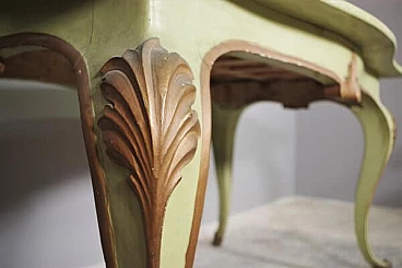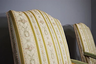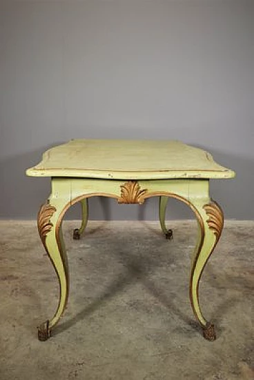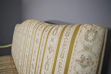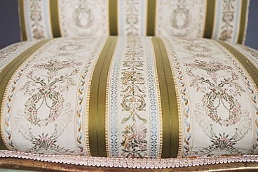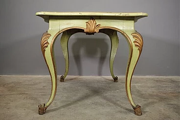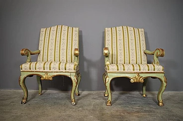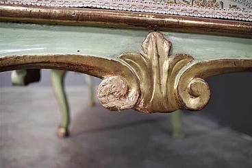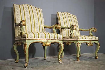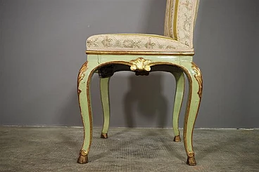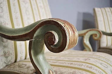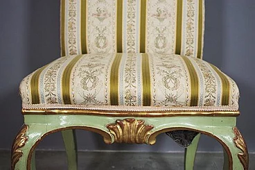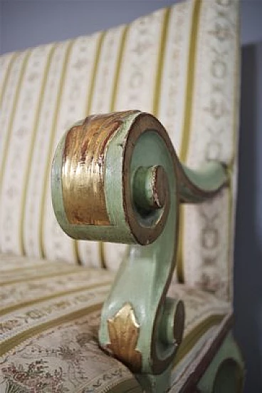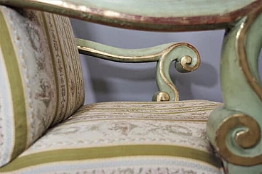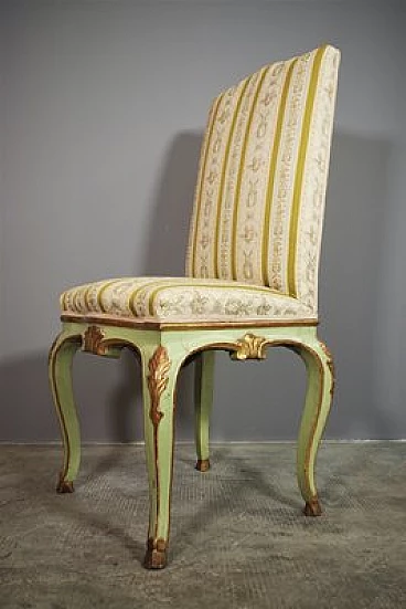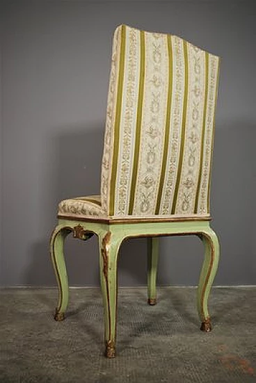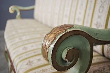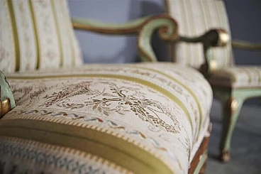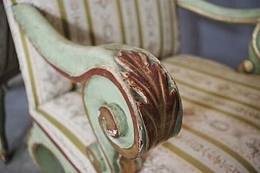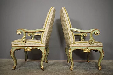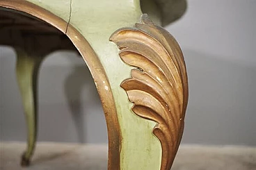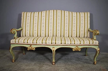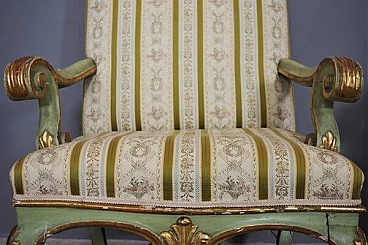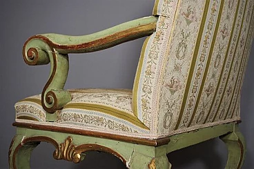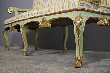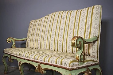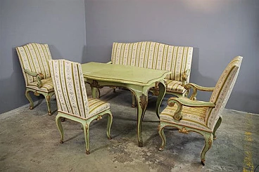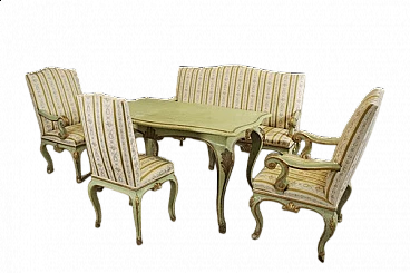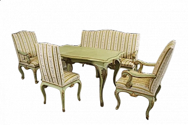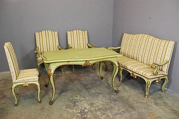 Venetian Baroque style living room set consisting of table, sofa, chair and pair of armchairs, mid-19th century. In need of restoration. The table is 80 cm high, 150 cm wide and 94 cm deep. The chair is 105 cm high, 52 cm wide and 46 cm deep; the seat is 50 cm high. The armchairs are 112 cm high, 72 cm wide and 59 cm deep; the seat is 52 cm high. The sofa is 110 cm high, 174 cm wide and 63 cm deep; the seat is 50 cm high.