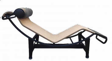 LC4 is the iconic and elegant chaise lounges of Le Corbusier, this is an edition in ecru fabric with cushion and footrest in dark brown leather, its peculiarity is to present the frame totally black which gives it a more harmonious appearance than the edition with chrome frame.