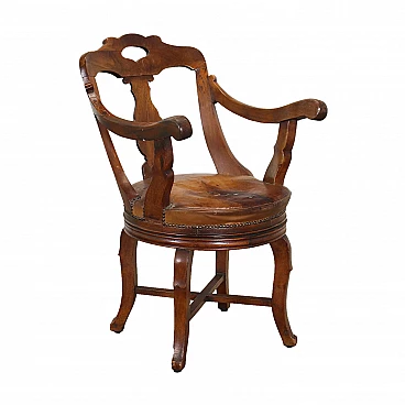 Louis-Philippe swivel armchair, supported by curved legs connected by a crossbeam, the seat is upholstered in leather, while the backrest is open.