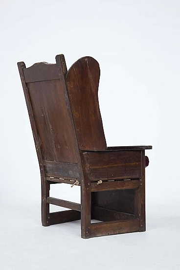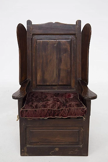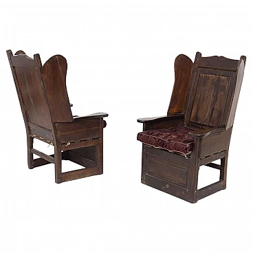 Pair of Italian armchairs made entirely of wood, dating back to the 1800s. The armchairs have a very distinctive back, with two wooden earrings that make the seat important. The seat is made with a soft cushion in red fabric outlined in gold under which there is an embroidered net that makes the seat soft and comfortable. The armchairs have two clearly defined rear feet, connected by a thin tubular wooden structure, while the front feet are made from a single block of wood. The lines of the armchairs are very hard and linear.