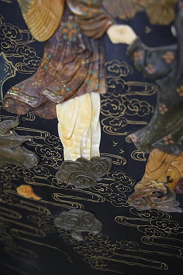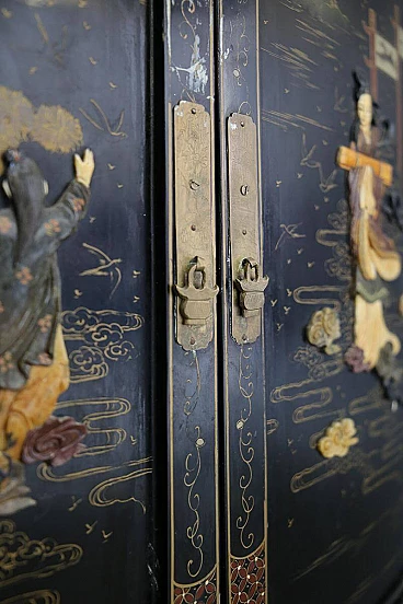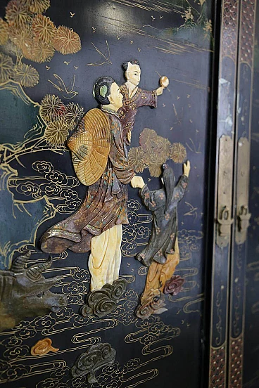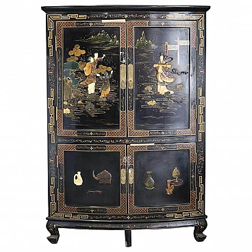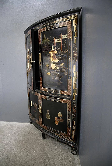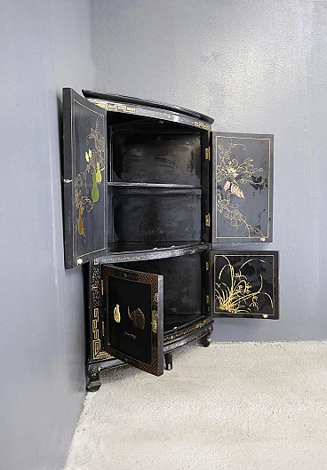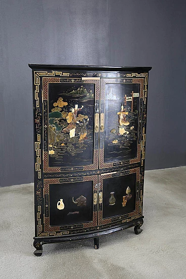 Chinese corner cabinet from the mid-20th century in black lacquer and stained soapstone. The corner cabinet has a double door opening, which is completely hand-painted both inside and outside the doors. The handles are made entirely of brass and have a beautiful inlaid clasp. The designs depict scenes from everyday life in Chinese society. As can be seen from the photos it has a slight break in one of the feet which can be restored on request: however, its condition is good due to time and wear. The interior shelves are in good condition and well maintained.