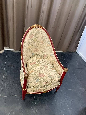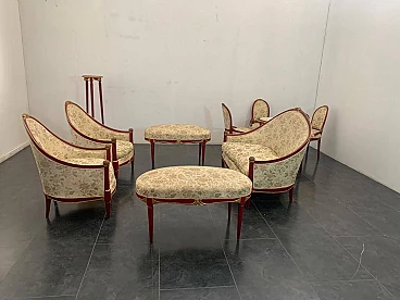 Prestigious and unique lounge set with tea corner, cardinal red lacquered furniture with finely carved knobs and gold leaf appliqués. Upholstery in generously thick jacquard fabric is a floral lampas with gold filaments depicting peonies or similar flowers, original fabric in excellent condition.