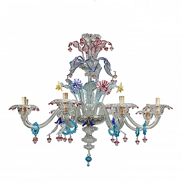 Murano chandelier with eight lights, in blown glass and colored blown glass.