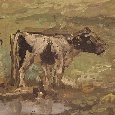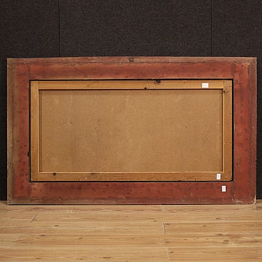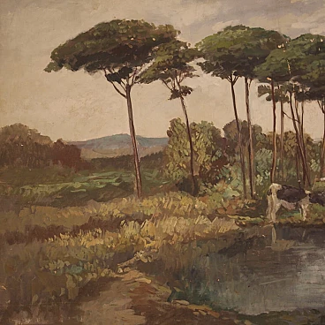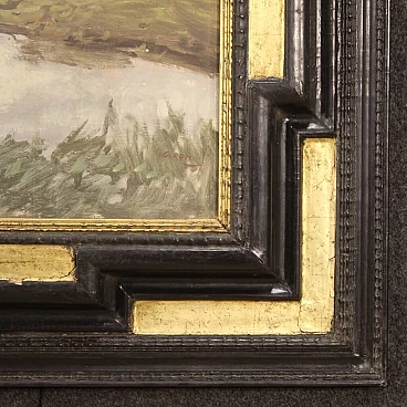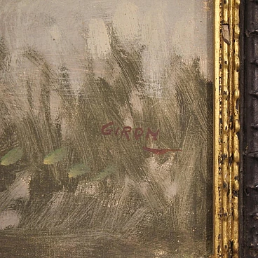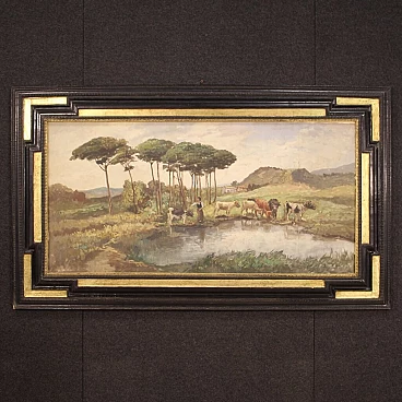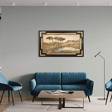 French painting from the middle of the 20th century. Oil painting on masonite depicting country landscape with shepherdess and cows with a good pictorial hand. A painting of great size and impact adorned with a pleasantly carved, ebonised and gilded wood and plaster frame (see photo). Fabulous decorating painting, for antique dealers and interior decorators, signed lower right Giron (see photo) under study. Of interesting perspective, enriched by a pond in the foreground and houses in the background (see photo), painting in overall good condition. Light painting H 58 x W 118,5 cm.