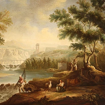 Italian painting from the second half of the 20th century. Oil painting on canvas depicting Landscape with figures in eighteenth-century style with a good pictorial hand. Painting of great size and impact, with pleasant depth and good brightness, for antique dealers and interior decorators. Modern frame in carved and gilded wood of beautiful decoration with some small marks (see photo). Ideal work to be placed in a living room or study, of excellent proportion. It has a signature in the lower left corner (see photo) which is being studied. In good condition. Light painting H 69 x W 99 cm.