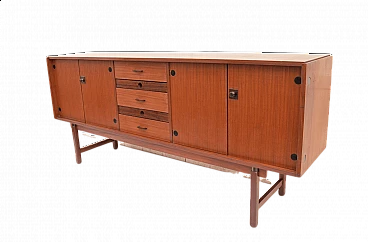 This sideboard dates from the 1960s. Produced by the Barovero furniture factory in Turin, it is made of brown teak veneer wood with black painted brass hinge inserts which characterised the production of this furniture factory. The clean and elegant design is that of the Nordic style that was fashionable at the time and which is currently much sought after. Entirely original furniture, in excellent condition, with slight signs of time.