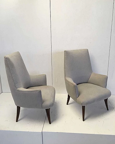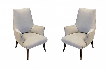 Coppia di eleganti poltroncine con piedini a sciabola in legno, rifoderate con tessuto color tortora.