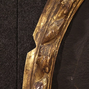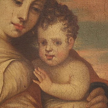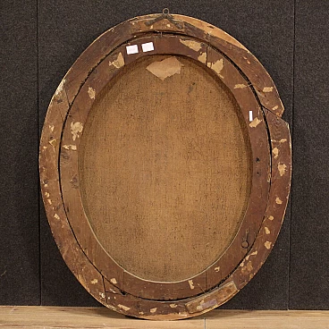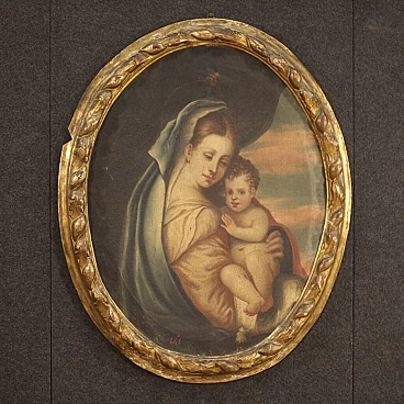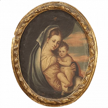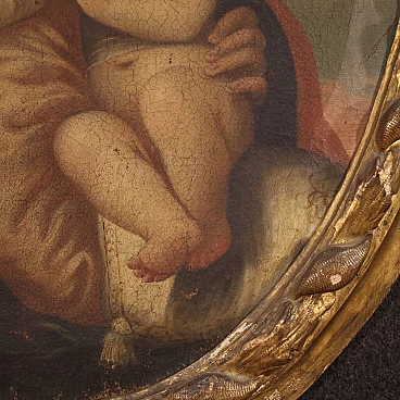 Old Italian painting from the 18th century. Oval oil on canvas painting depicting religious subject Madonna and Child of good pictorial hand. Contemporary carved and gilded wooden frame of very good quality with a small lack of wooden decoration on the left (see photo) and some small fall of colour (structurally sound). Beautifully sized and pleasantly decorated painting, for antique dealers, interior designers and collectors of antique sacred art. Painting in fabulous patina with a colour fade near Mary's halo and some small marks along the border of the canvas (see photo). Painting of great delicacy in the drapery and the faces of the characters (see photo). It has undergone a light conservative restoration during the 20th century. In fair condition, to be restored. Light painting H 89 x W 71 cm.