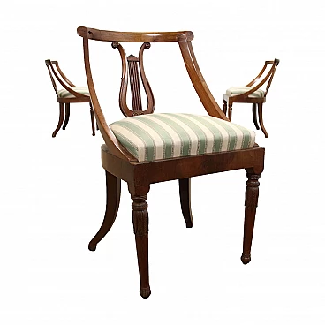 Group of three walnut Empire chairs supported by four legs, of which the back ones are saber-shaped and the front ones turned and carved with leaf motifs. The seat is upholstered, and the open back is carved and pierced with lyre motifs.