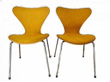 Pair of vintage chairs from the 1980s by Arne Jacobsen for Fritz Hansen. 3107 butterfly. Wooden frame with yellow/orange fabric upholstery chromed aluminum base. Chairs are vintage and therefore have defects due to age. The structure is in excellent condition the upholstery to be changed as there are stains and small hole due to use. Marked both chairs.