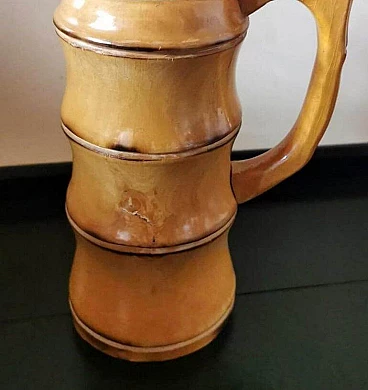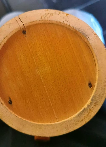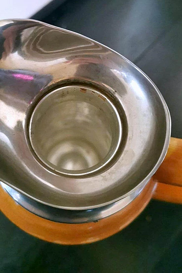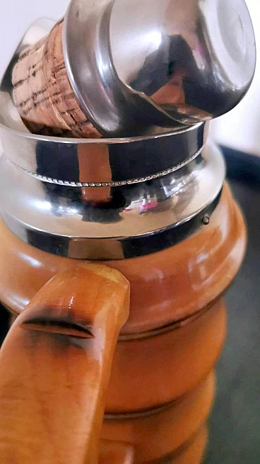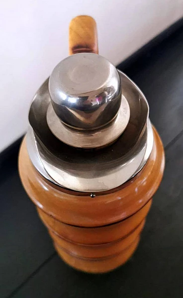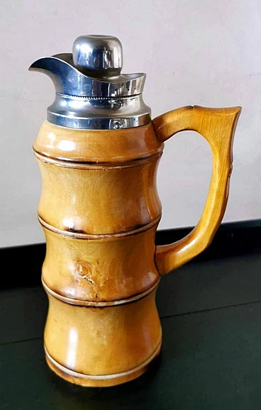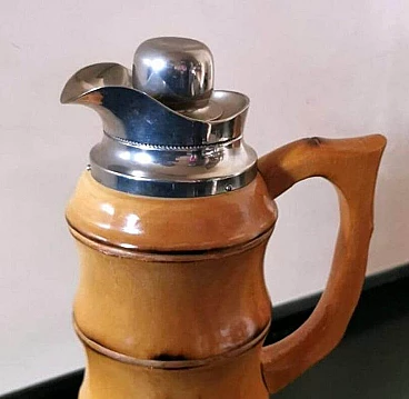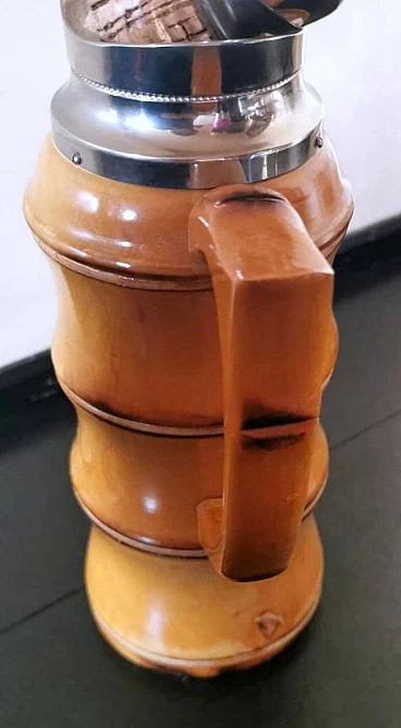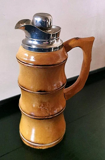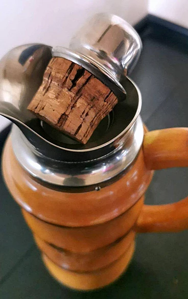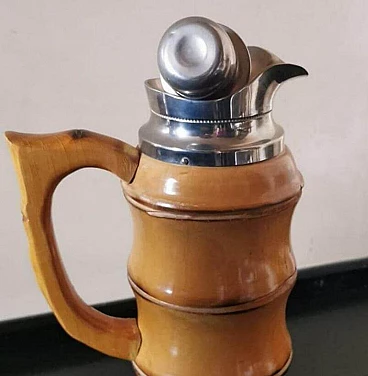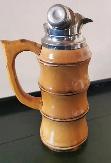 Elegant and very particular thermos; the structure is made of sturdy Asian bamboo and inside there is a silvered glass part with a double cavity (Sir James Deward's vase) with a cork stopper for hermetic closure; the simple but sturdy shape of the handle is very particular; the metal part at the top, which is inserted into the bamboo, is shaped like a beak to facilitate the pouring of liquids; on the side of the thermos (see photo) one notices what may seem to be an imperfection, but is none other than a natural bamboo knot which attests to its authenticity. Natural bamboo, with its warm shades of colour, makes for a distinctive and original product. Analysing its physical and mechanical characteristics, it is hard, strong and dimensionally stable, able to withstand stress and pressure has great strength. It is stronger than oak, which is considered the most resistant wood. The thermos was designed by the Italian designer, furniture maker and decorator Aldo Tura (1909-1963) and produced between 1950 and 1955 by the company he founded in 1939 in Cusano Milanino (Lombardy-Italy). Working between the trends of Art Deco and modernism, Tura created luxury accessories and unique furniture, characterised by rich materials, sculptural forms and exclusive craftsmanship techniques. In the post-war years, while many furniture manufacturers were adapting their working methods to mass production, Tura continued to engage in traditional craftsmanship methods. He preferred complex forms and labour-intensive processes that could not be replicated in a large-scale production system. His mix of Art Deco, Art Nouveau and minimalist modern design pushed the boundaries of traditional craftsmanship. In his designs he used a wide range of unusual materials such as bamboo, goatskin, eggshells, parchment and wood veneers, employing his favourite colours: yellow, red and green. The Brooklyn Museum in New York has several of Tura's works, which were originally displayed in the touring exhibition 'Italy at Work: Her Renaissance in Design Today'. Many of his products are true collectors' items, in particular creations such as our thermos finished in bamboo and sometimes in goatskin and parchment. As we have said, Tura never adapted to the industrial process and this has meant that there are still a limited number of his objects on the market today. The use of bamboo to make our thermos has given us an object worthy of one of the greatest names in Italian design.