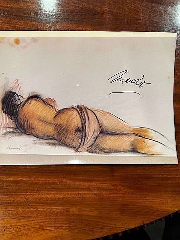 Drawing with coloured pencil of Giacomo Manzù's Lying Nude, 1970s