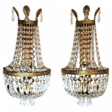 Pretty and refined pair of wall lamps with a typical balloon shape; the structure, made of gilded brass, is enriched by refined decorations in the shape of soft garlands; in the upper part three leaves are arranged, embellished with prismatic drop-shaped crystals; the whole frame of each wall lamp is adorned with chains of lead crystals, cut, ground and faceted, manually joined by decorated metal wires; at the top all the crystals have a flattened octagonal shape, while at the bottom there are also rectangular prismatic crystals and below these, there is a group of prismatic drops equal to those at the top, all forming a cascade of shining beauty. At the back there is a brass plate in the shape of a cross which conceals the electrical wires and allows the wall lights to be placed on the wall. The structure of the two wall lights is the classic and iconic balloon structure, known in French as the "sac-à-perle" because it resembles the shape of a basket, which originated during the reign of Louis XIV but had its heyday during the period of Louis XVI; the wall lights were created between 1960 and 1965 by a workshop on the outskirts of Paris, where the craftsman managed to create two unique, precious and elegant products. The sconces have a single light point, but when they are turned on, the ground crystals refract the light with infinite facets, and enchanting reflections are created that enhance the decorative effect, but they can also give an exciting glow thanks to the natural light reflected by the crystals; their extreme classicism and their romantic line, make them extremely versatile and easy to place in any environment. The pair is in good condition. The electrical system is working but the wiring is European, the compatibility of the voltage in other countries should always be verified by an electrician before use.
