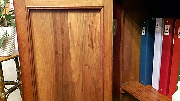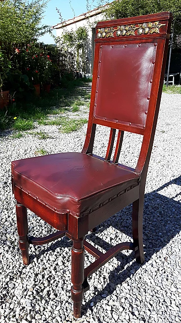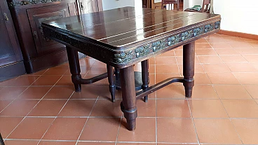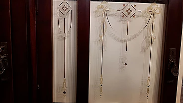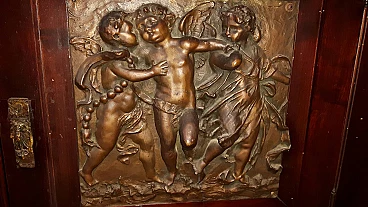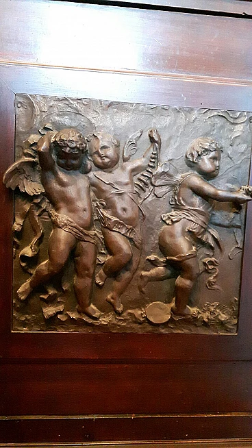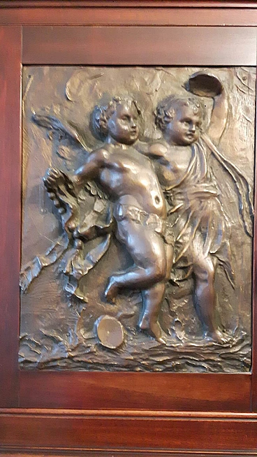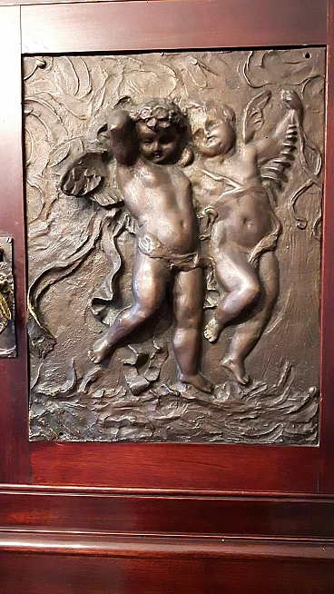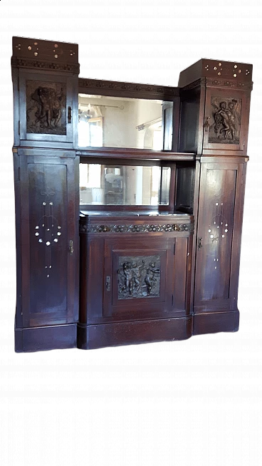 Art Deco dining room, early 20th century. Consisting of: Mirror cabinet; Display cabinet; Table; 8 Chairs. Measurements: Furniture h220x182x47; Table: 113x127 extendable with its own planks. Materials: The wood could be solid chestnut slab mahogany. The interiors are clear with all the original boxes; the 6 tiles seem to be made of bronze; mirrors and glass are original and intact, original ornate glass; the 8 chairs have the seat to be restored; some wood finishes and mother of pearl decoration have been preserved; marble tops, one of which is broken in two parts. Panels: 6 bronze panels of 4 different subjects: 4 rectangular cm 27x35 (2 subjects), 2 squares of different subjects cm 34x34