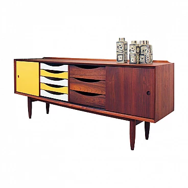 Danish teak low cupboard produced by Bruno Hansen, in perfect condition. The sideboard is extremely versatile: the sliding doors, lacquered mustard yellow and white on one side and teak essence on the other, are reversible, so as to transform the appearance of the furniture at will. There is a row of exposed drawers lacquered in white and mustard yellow and another row of teak drawers. The rounded edges of the structure evoke the best functionalist tradition of 20th century Danish design. The back is also carefully finished in teak essence, so that the sideboard can be placed in the centre of a room and appreciated from wherever you look.