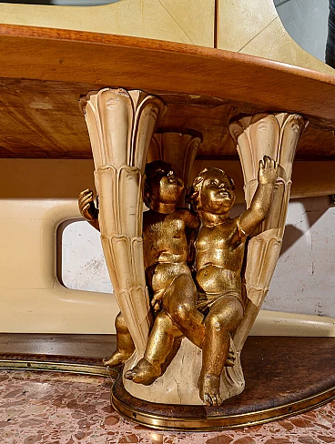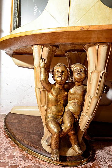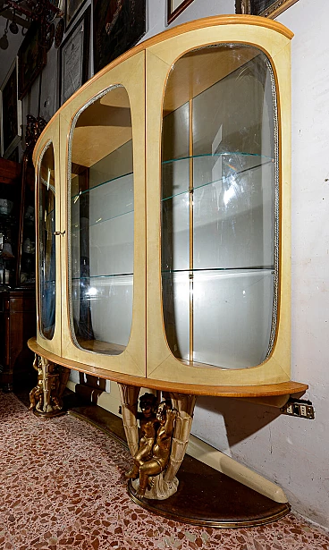 An important rounded display case with soft, rounded shapes, panelled in parchment and maple with an open compartment in the base, raised off the ground with an interlacing of cornucopias and gilded cherubs with curved side glass and original interior shelves.