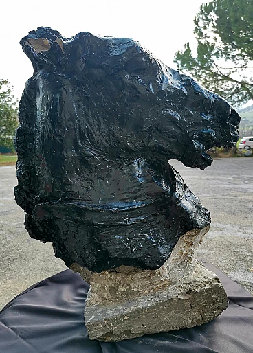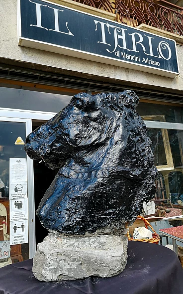 Statue depicting a horse's head with a worked stirrup that decorates the horse's neck giving it an important and regal appearance. The statue is made of polished black painted concrete and dates back to the middle of the 20th century.