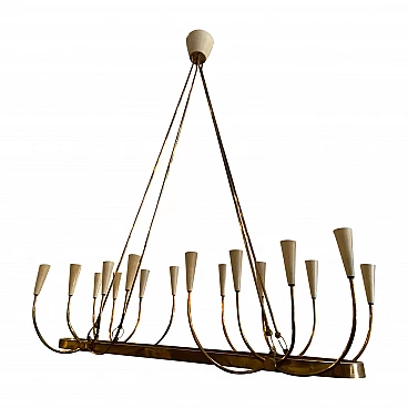 It's a very large 18 lights brass oval chandelier in the manner of Fontana Arte, made in Italy in the 50s. It works 110-240 volts and needs regular e14 bulbs. Brass is in original patina, this creates a vibrant look.