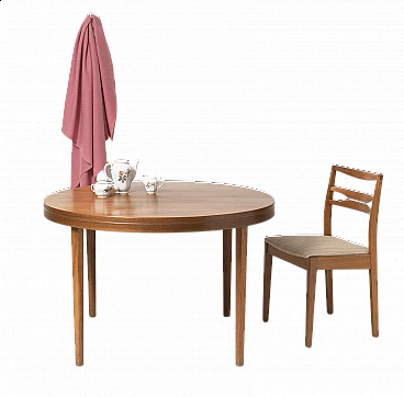 Swedish teak round table with two extensions. Comfortably seats eight to ten people fully extended. Manufactured by Skaraborgs Möbelindustri, Tibro. Restored. Sweden 1960. L.115 x D.115 x H.73 (50+50 extensions). fully extended 215 cm