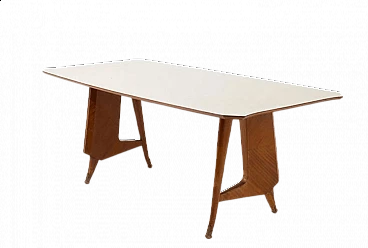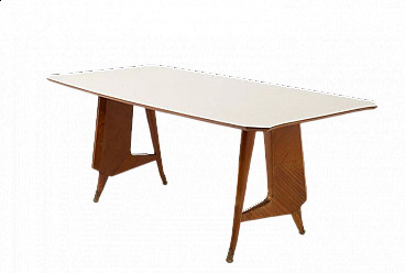 Wooden table with beige Formica top and brass tips. DASSI manufacture. 1950s. Measurements. Length cm. 206 Height cm. 80 Depth cm. 90 approx.