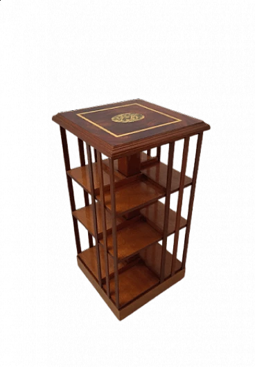 English mahogany veneer swivel bookcase with elegant inlays on the top. It has a structure with open compartments and is equipped with wheels for easy movement. Very practical and functional. Very good condition.
