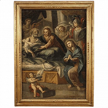 Ancient Italian painting from the 18th century. Work oil on canvas depicting a religious subject Transit of St. Joseph of good pictorial quality. Beautifully sized picture, full of characters and decorative elements, for antique dealers, interior decorators and collectors of ancient sacred art. Wooden frame not coeval, from the 20th century, carved, gilded and adapted to the painting (see photo). In the upper part of the frame a small wooden band has been added to cover 1.5 cm of light in the frame (see photo). Painting of great pictorial intensity that has undergone a conservative restoration, relining, replacement of the frame and color recovery in different points (see photo). There is a monogram at the bottom (see photo) under study. In good condition with some signs of restoration. Light painting H 103 x L 75 cm.