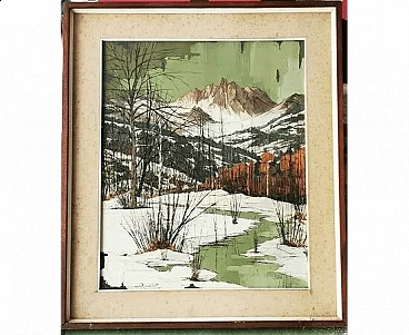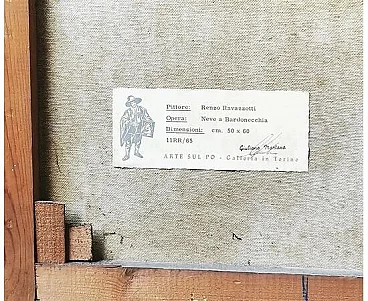 Painting by Renzo Ravazzotti oil on canvas, Neve a Bardonecchia, signed and dated February 1965 Galleria Torino - Arte sul Po. Renzo Ravazzotti was born in Alessandria on 28 February 1923 into a wealthy family. In 1932 he moved to Turin, where he attended the Istituto Magistrale. From an early age he had many interests: sport (particularly skiing), philosophy, reading, but above all painting. He studied with the sculptor Michelangelo Monti and the painter Rava in the 1940s. He illustrated Prof. Di Macco's four volumes of Medical Pathology with drawings of histology from life. In his youth he went through different painting experiences, from Flemish to graffiti to gouache, to refine his present technique: a stylised and spatulate figurative, essential and precise. He lives and works in Turin and is married to a wife who tries to tear him away from his painting to take him on a world tour: he draws inspiration for many of his works from these travel experiences, set on the Norman coasts or in Greek, Spanish or Abruzzese villages, on boats from Romagna or the Atlantic, in the narrow streets of Venice or French farmhouses. Or among the bare trees of his Val di Susa where he escapes when he can. He also has a daughter and two granddaughters: none of the three likes to paint, although, as children, he has involved them in paintings that he never exhibits and has dedicated to them a rich collection of sad clowns, the only figures in his repertoire. Over the years he has participated in selected exhibitions, because he paints little and essentially for himself; several critics have written about him.