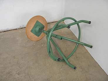 Adjustable-height swivel school stool, 1980s. Oak seat and green painted metal structure.