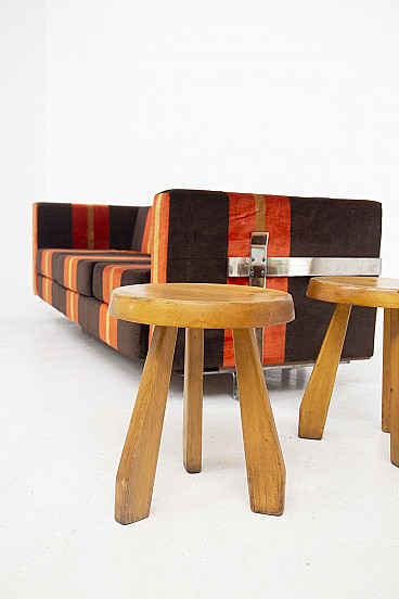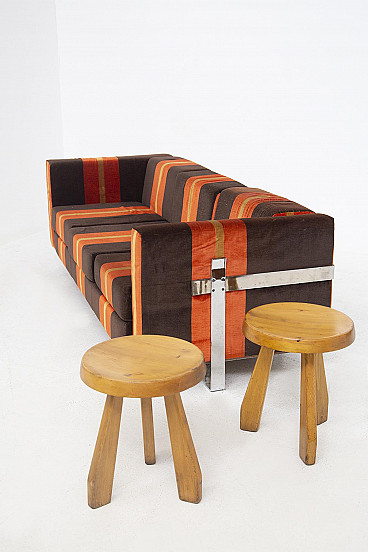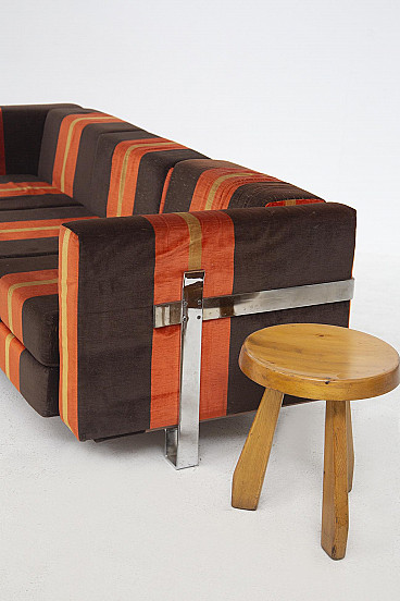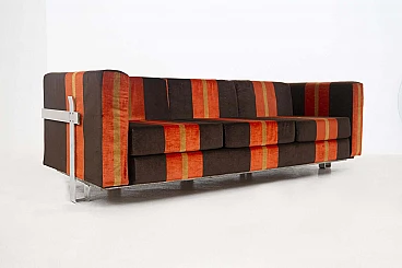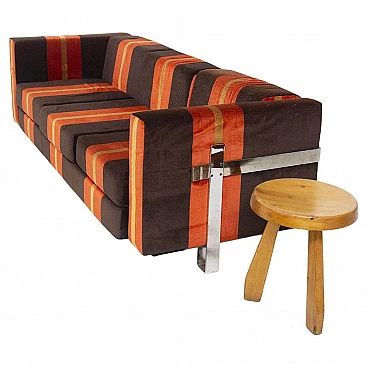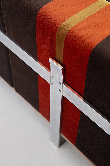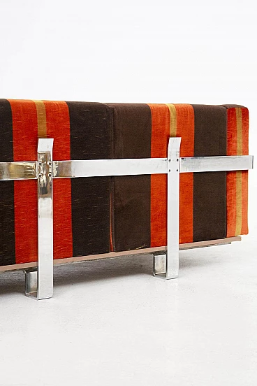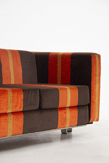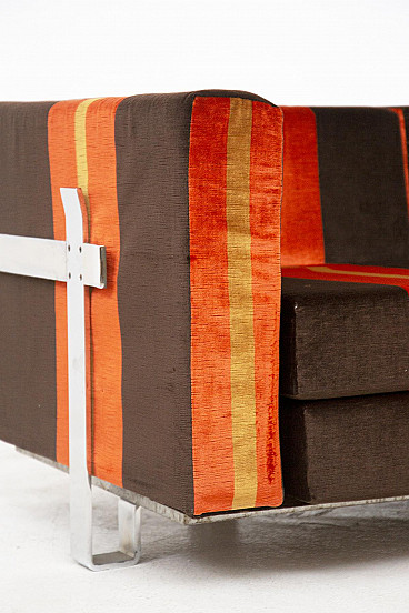 Beautiful fabric sofa designed by Luigi Caccia Dominioni for the fine manufacturer Azucena Italia. The vintage sofa is made of brown, orange and yellow striped fabric, which creates a very colourful geometric effect. The lines are very hard and geometric, wonderfully eccentric. The frame is made of anodised aluminium, shiny silver, which connects to the spectacular and beautiful square, hollowed-out feet. The cushions also function as square, very colourful armrests.