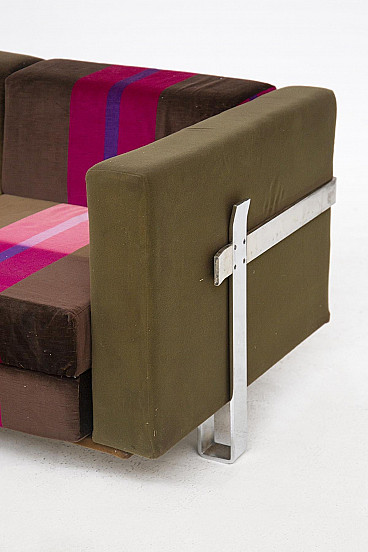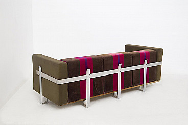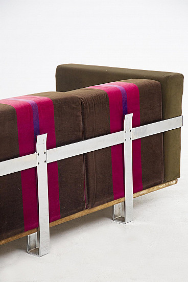 The vintage sofa is made of brown, fuchsia and purple striped fabric, which creates a very colourful geometric effect. The lines are very hard and geometric, wonderfully eccentric.