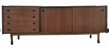 Long wooden sideboard with 4 drawers and 2 sliding doors, 1970s. Fully functional, but with age-related signs of wear, material dents and repairs.
