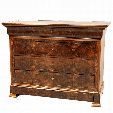 Dresser with solid walnut chests of drawers and walnut burl veneer, cappuccino, Luigi Filippo, mid 19th century. Furniture already restored and with certificate of authenticity.