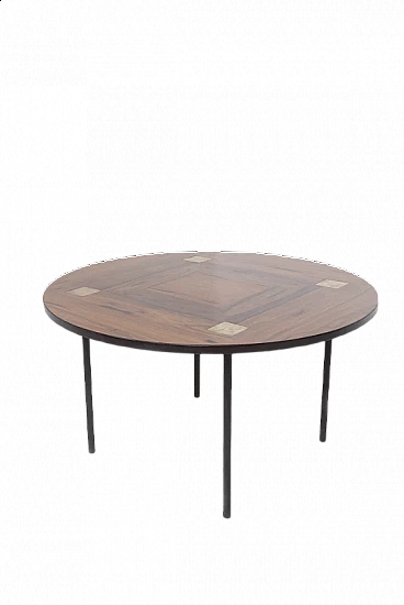 Living room table in wood designed by Ettore Sottsass for Poltronova in 1959. The structure is supported by black metal legs, and the wooden top is finished with square brass inserts. In good condition, with few signs of time.