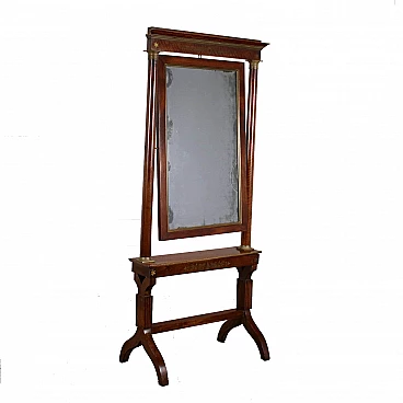 Empire Psyche supported by uprights connected by crossbeams and resting on sabre feet; made of mahogany, it is decorated with brass inlay, the mirror is made of mercury.