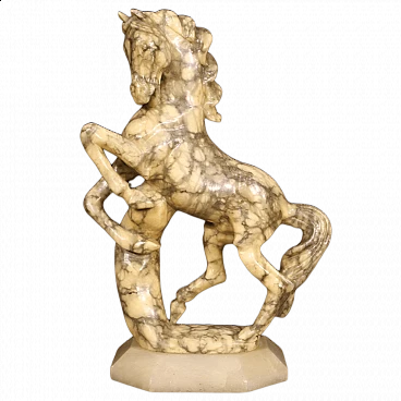 Italian sculpture from the second half of the 20th century. Marble object with alabaster base depicting a prancing horse. Sculpture of beautiful size and decoration for antique dealers, interior decorators and collectors. Horse showing some signs of time and a small chipping on the left ear (see photo), easily restorable. Structurally sound sculpture, overall in fairly good state of preservation.
