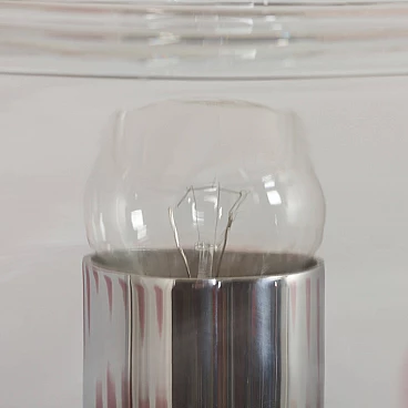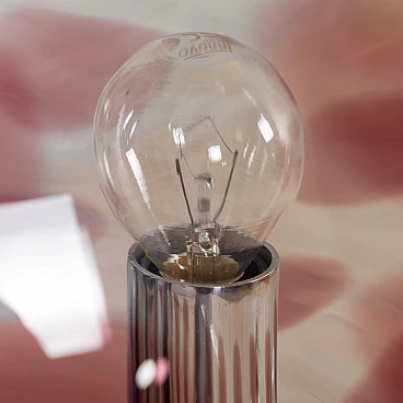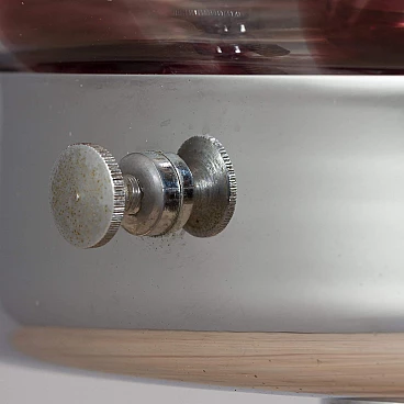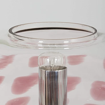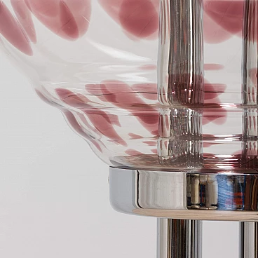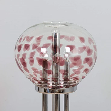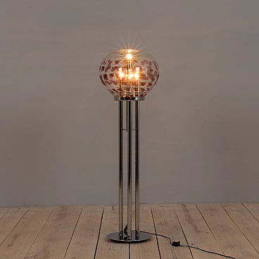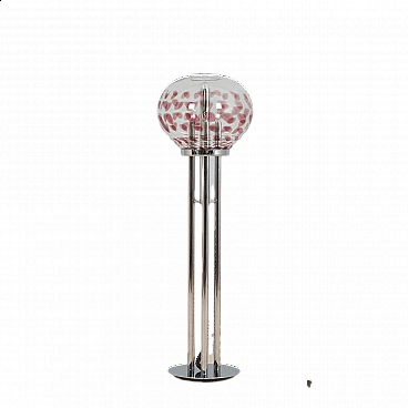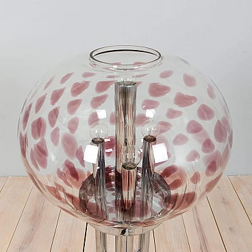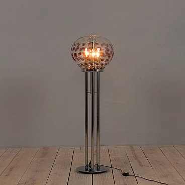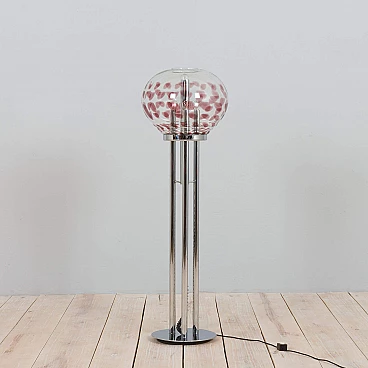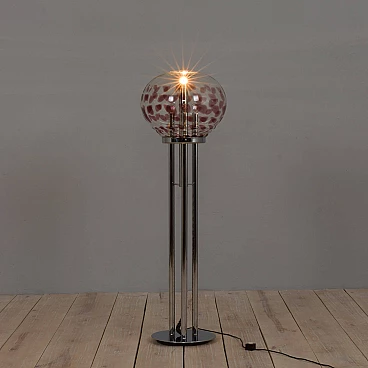 Space-age floor lamp with a spectacular thick Murano glass globe from 1970s Italy. A clear glass shade with a purple pattern provides striking illumination when lit. A double-action switch offers three lighting options. The remarkable spherical lampshade rests on chrome-plated supports and base. It is a unique object dedicated to all those people who want to give a touch of unusual combination of art and modern design to their home decoration. It is reminiscent of the works of Toni Zuccheri from the same period. The lamp is in very good vintage condition with original wiring - cable length 240 cm with double click foot switch.